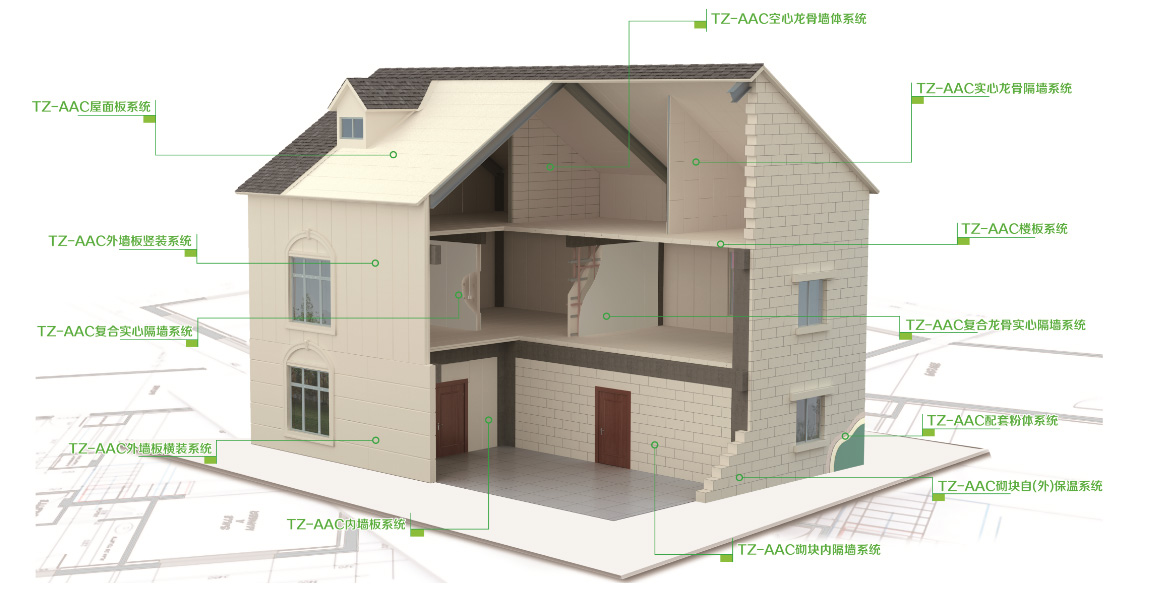 天筑AAC产品系统集成是指以天筑产品系列(砌块、板材、配套辅料配件等)为基础,以专用安装节点、工艺和专有技术为核心,结合长期工程实践形成的针对不同建筑类型(工业建筑、公共建筑、住宅建筑)和建筑结构(混凝土结构、钢结构等)的产品应用系统。